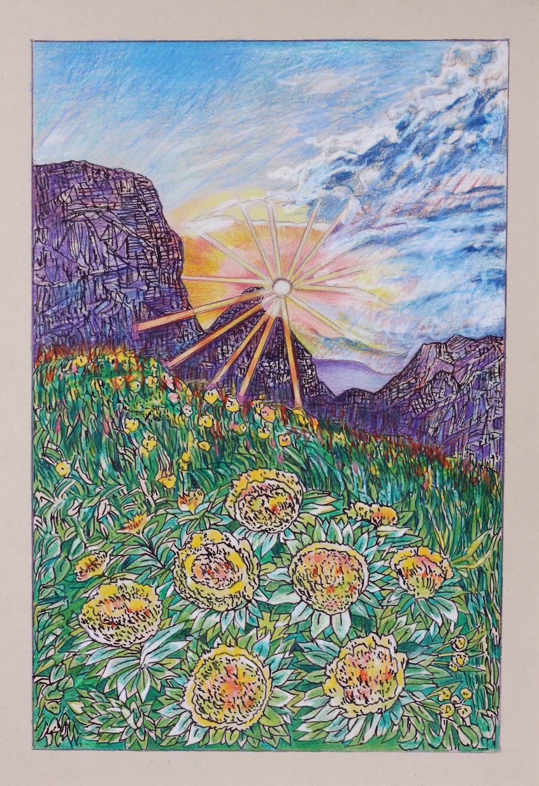 Montagne Avec Soleil Couchant Et Buisson D Orpins Mountain With